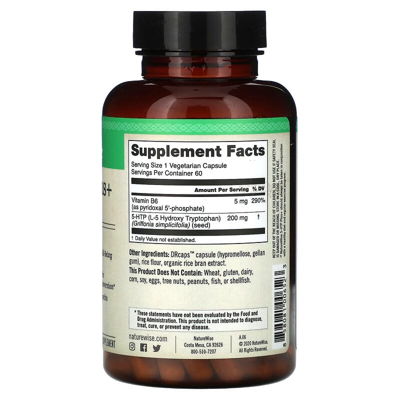 Viên uống 5-HTP Plus NatureWise 200 mg hỗ trợ tinh thần, giấc ngủ sâu, 60 viên chay an toàn, tự nhiên., UPC 858081006523