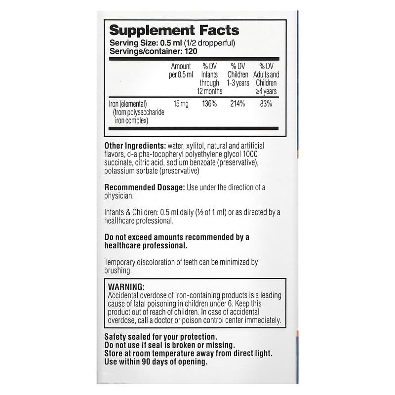 – Sắt (elemental): 15 mg từ polysaccharide iron complex, cung cấp 136% giá trị dinh dưỡng hàng ngày cho trẻ em dưới 12 tháng, 214% cho trẻ em từ 1-3 tuổi và 83% cho người lớn và trẻ em từ 4 tuổi trở lên.