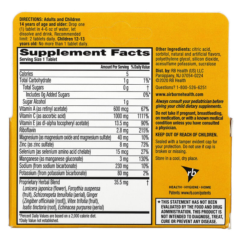 Viên sủi AirBorne Immune Support Zesty Orange bổ sung vitamin tăng cường miễn dịch hương cam thơm ngon 10 viên tiện lợi bảo vệ sức khỏe tối ưu 647865100010