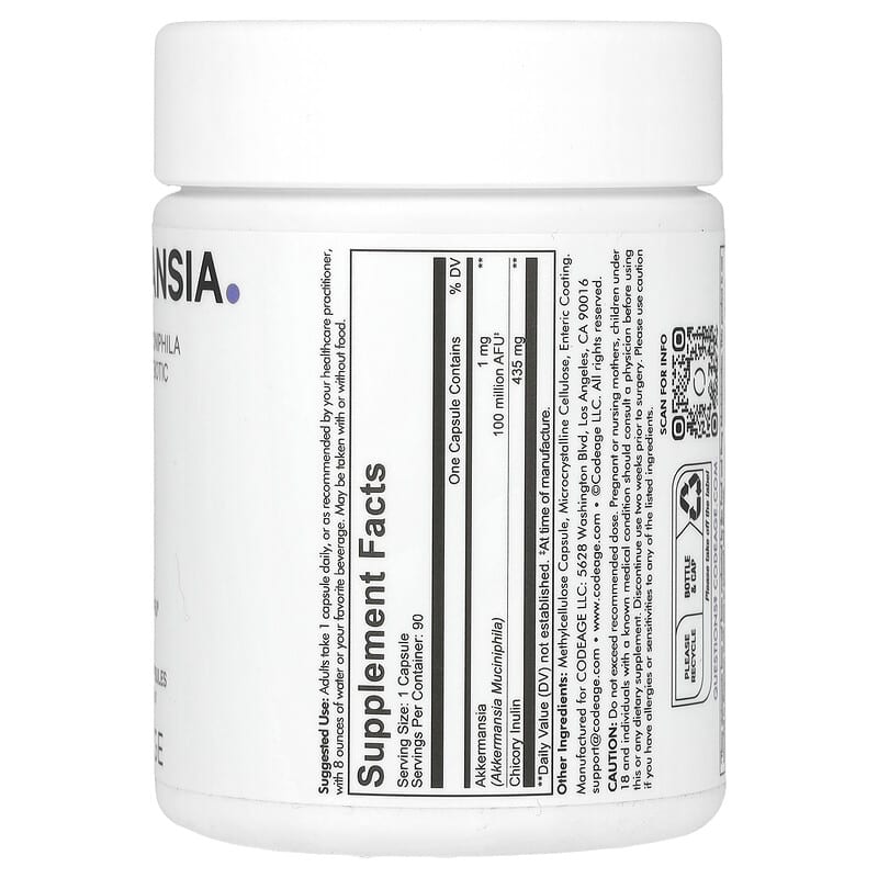 Codeage Akkermansia được chiết xuất từ Akkermansia muciniphila, một loại vi khuẩn probiotic có lợi cho hệ tiêu hóa. Mỗi viên nang cung cấp 100 triệu AFU (Active Fermentation Units) Akkermansia, giúp thúc đẩy sự phát triển của vi khuẩn có lợi trong ruột. Ngoài ra, sản phẩm còn chứa chicory inulin, một loại chất xơ từ rễ cây chicory, được biết đến như một prebiotic giúp nuôi dưỡng và hỗ trợ sự phát triển của Akkermansia muciniphila.