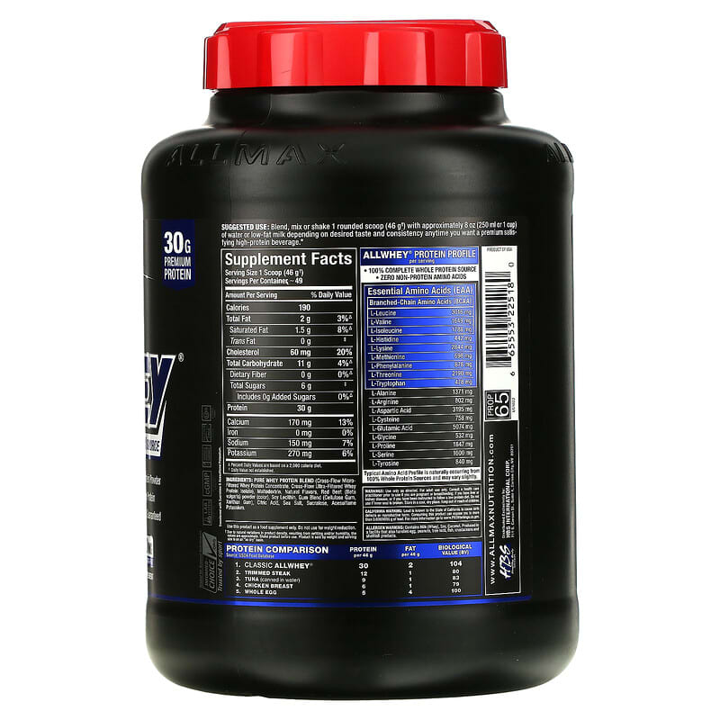 ALLMAX Classic AllWhey là một loại whey protein cao cấp, được chiết xuất hoàn toàn từ whey protein concentrate và whey protein isolate. Mỗi khẩu phần 46 g cung cấp đến 30 g protein, giúp hỗ trợ phục hồi cơ bắp sau các bài tập cường độ cao. Nghiên cứu cho thấy việc tiêu thụ protein sau khi tập luyện giúp tăng tốc độ phục hồi cơ bắp và cải thiện hiệu suất tập luyện.