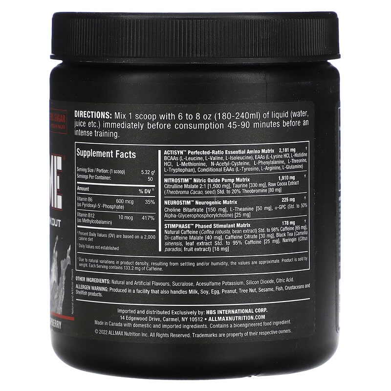 – NITROSTIM™ Nitric Oxide Pump Matrix: 1,910 mg, bao gồm Citrulline Malate, Taurine và Raw Cocoa Extract.