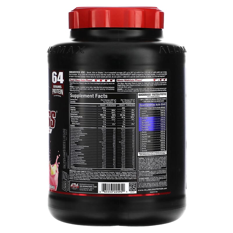ALLMAX Quick Mass là một sản phẩm bổ sung dinh dưỡng dành cho những người tập luyện thể thao, đặc biệt là những ai đang trong giai đoạn tăng cường khối lượng cơ bắp. Sản phẩm cung cấp 1010 calo và 60 gram protein trong mỗi lần sử dụng, giúp người dùng nhanh chóng đạt được mục tiêu tăng cường khối lượng cơ bắp. Nghiên cứu tại California State University cho thấy, những người tiêu thụ sản phẩm này đã tăng trung bình 6.9 lbs (khoảng 3.1 kg) tổng khối lượng cơ thể trong vòng 8 tuần.