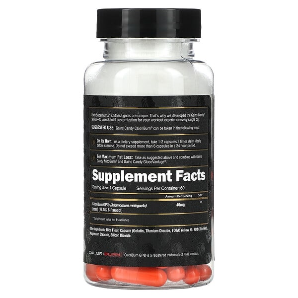 Sản phẩm Gains Candy CaloriBurn chứa thành phần chính là CaloriBurn GP® (Aframomum melegueta) với hàm lượng 40 mg mỗi viên. Đây là một loại thảo dược tự nhiên đã được nghiên cứu và chứng minh có khả năng hỗ trợ giảm mỡ, thúc đẩy quá trình trao đổi chất và cải thiện hiệu suất thể chất. Ngoài ra, sản phẩm còn chứa các thành phần phụ như bột gạo, gelatin, magnesium stearate và silicon dioxide, giúp bảo quản và duy trì chất lượng sản phẩm.