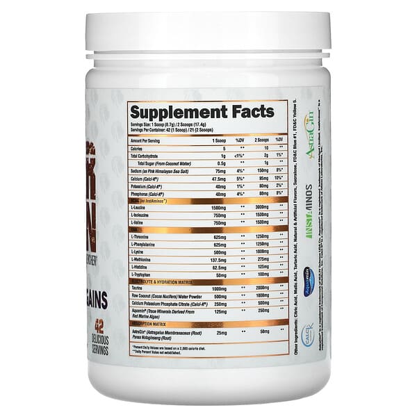 – BCAA (Branched-Chain Amino Acids): 3000mg (L-Leucine, L-Isoleucine, L-Valine) giúp tăng cường tổng hợp protein và giảm thiểu mệt mỏi.