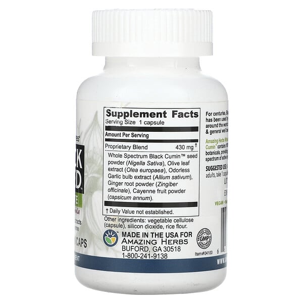 Proprietary Blend Whole Spectrum Black Cumin™ seed powder (Nigella Sativa), Olive leaf extract (Olea europaea), Odorless Garlic bulb extract (Allium sativum), Ginger root powder (Zingiber officinale), Cayenne fruit powder (capsicum annum) | 430 mg | † |