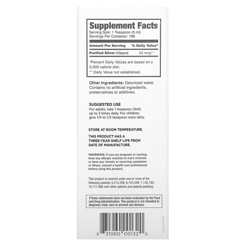 – Bạc tinh khiết (Purified Silver): 10 ppm, cung cấp 50 mcg bạc mỗi khẩu phần. Bạc đã được biết đến với khả năng kháng khuẩn và hỗ trợ hệ miễn dịch.