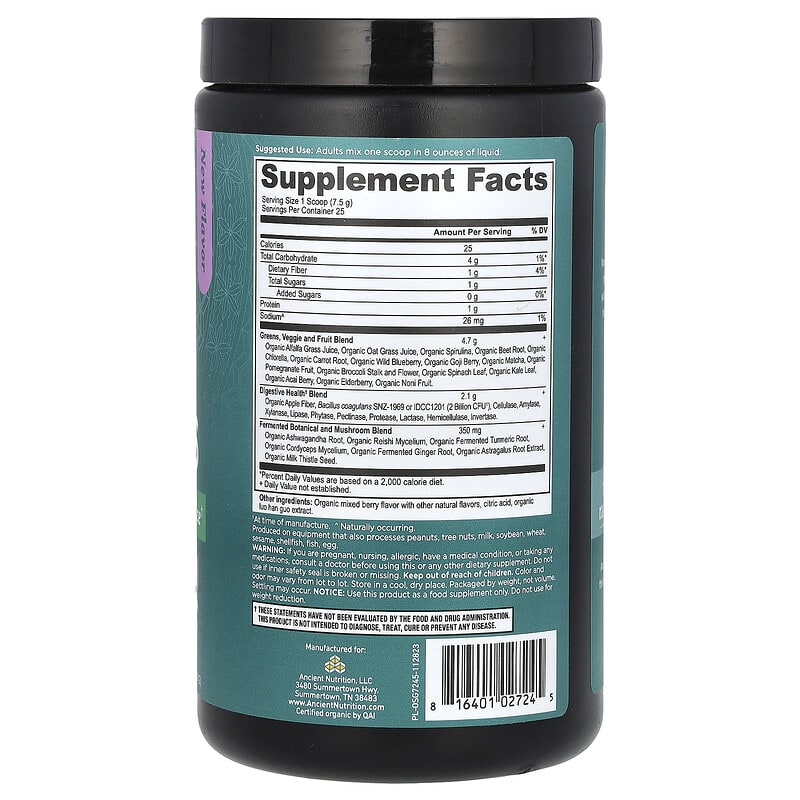 Giới thiệu sản phẩm Ancient Nutrition, Bột Rau Xanh Hữu Cơ Trái Cây Berry, 189g