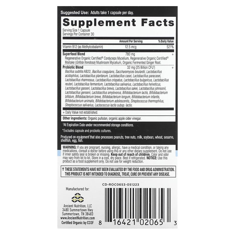 Probiotics Ngày Một Lần Ancient Nutrition 25 tỷ CFU, hỗ trợ tiêu hóa và sức khỏe đường ruột, 30 viên tiện lợi., UPC 816421020653