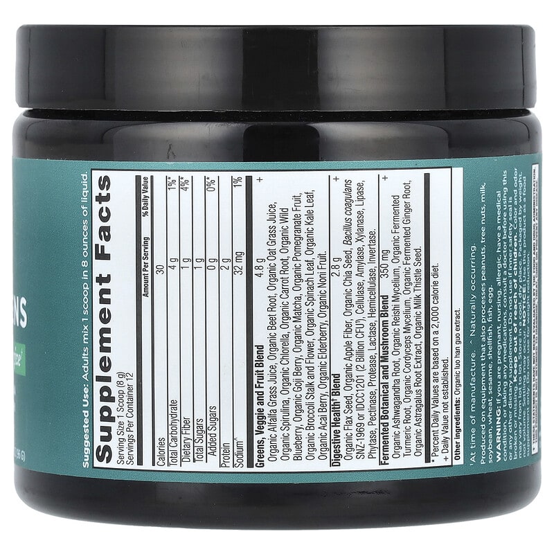 Greens, Veggie and Fruit Blend Organic Alfalfa Grass Juice, Organic Beet Root, Organic Oat Grass Juice, Organic Spirulina, Organic Chlorella, Organic Carrot Root, Organic Wild Blueberry, Organic Goji Berry, Organic Matcha, Organic Pomegranate Fruit, Organic Broccoli Stalk and Flower, Organic Spinach Leaf, Organic Kale Leaf, Organic Acai Berry, Organic Elderberry, Organic Noni Fruit. | 4.8 g | † |