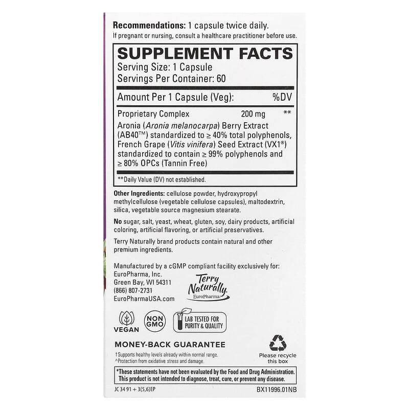 Proprietary Complex Aronia (Aronia melanocarpa) Berry Extract (AB40™) standardized to ≥ 40% total polyphenols, French Grape (Vitis vinifera) Seed Extract (VX1®) standardized to contain ≥ 99% polyphenols and ≥ 80% OPCs (Tannin Free) | 200 mg | ** |