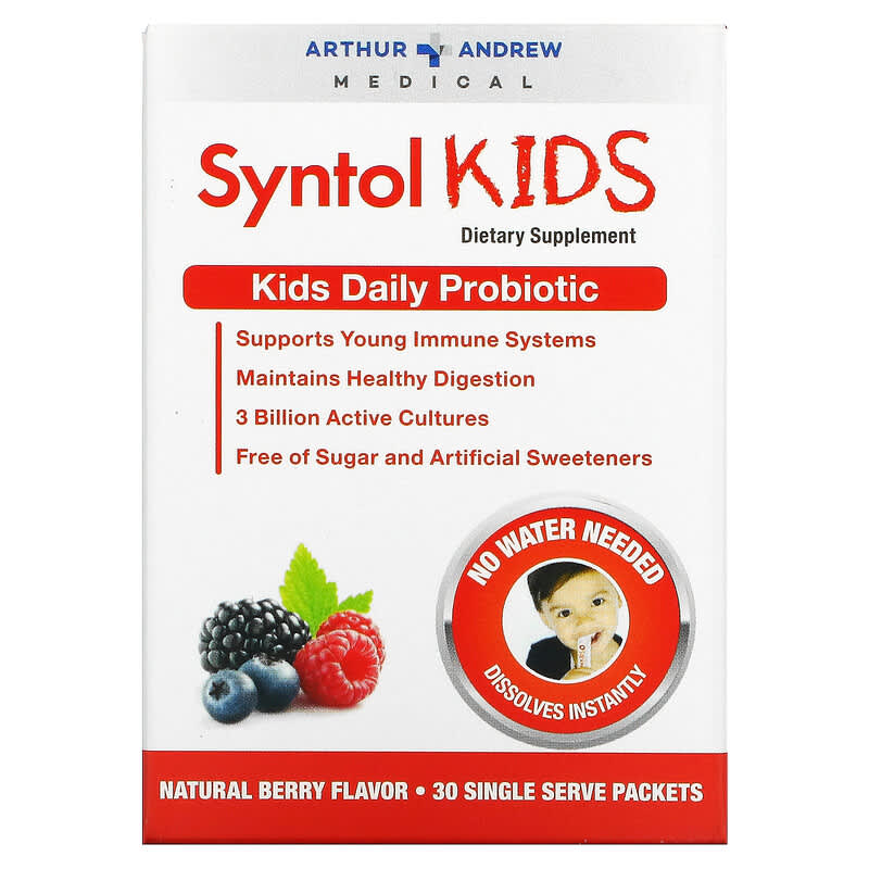 Probiotic tự nhiên Syntol Kids vị dâu cho trẻ hàng ngày, 30 gói tiện dụng từ Arthur Andrew Medical hỗ trợ tiêu hóa và hệ miễn dịch khỏe mạnh. 855571001884
