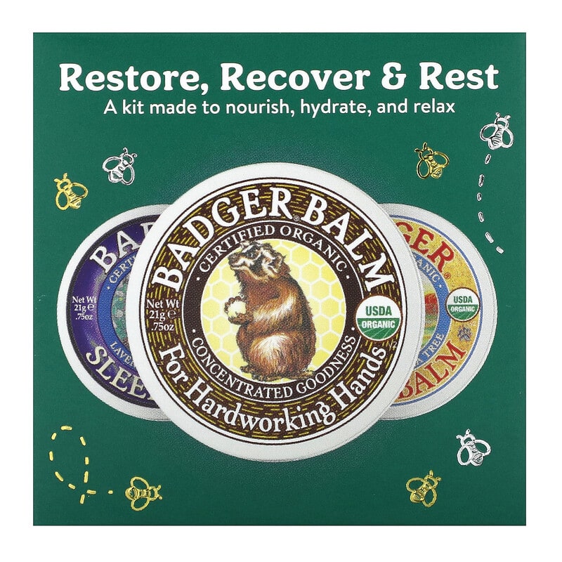 Badger Restore Recover & Rest Balm Trio bao gồm 3 loại balm với các thành phần tự nhiên và hữu cơ: