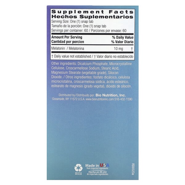 Viên uống Melatonin 10 mg Bio Nutrition giúp cải thiện giấc ngủ, giảm căng thẳng, hỗ trợ sức khỏe tinh thần. 60 viên cho giấc ngủ sâu., UPC 854936003648