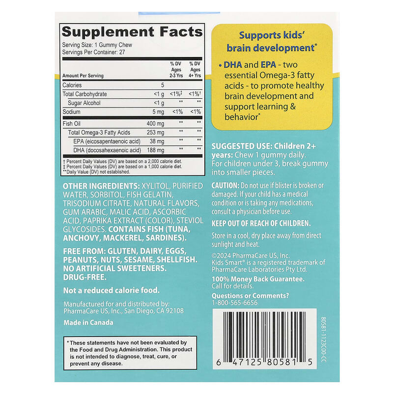 Viên nhai Bioglan Kids Smart Vita Gummies tăng cường trí não cho trẻ từ 2 tuổi, hương tutti frutti, không đường, 27 viên., UPC 647125805815
