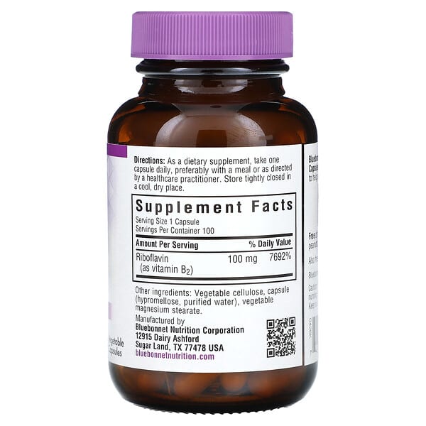 Mỗi viên nang Bluebonnet Nutrition Vitamin B2 cung cấp 100 mg Riboflavin, tương đương với 7692% giá trị hàng ngày cần thiết cho cơ thể. Sản phẩm được làm từ thành phần tự nhiên và không chứa các chất gây dị ứng phổ biến như sữa, trứng, cá, động vật có vỏ, hạt cây, đậu phộng, lúa mì, đậu nành và mè. Bên cạnh đó, sản phẩm còn hoàn toàn không chứa gluten, lúa mạch, gạo, natri và đường.