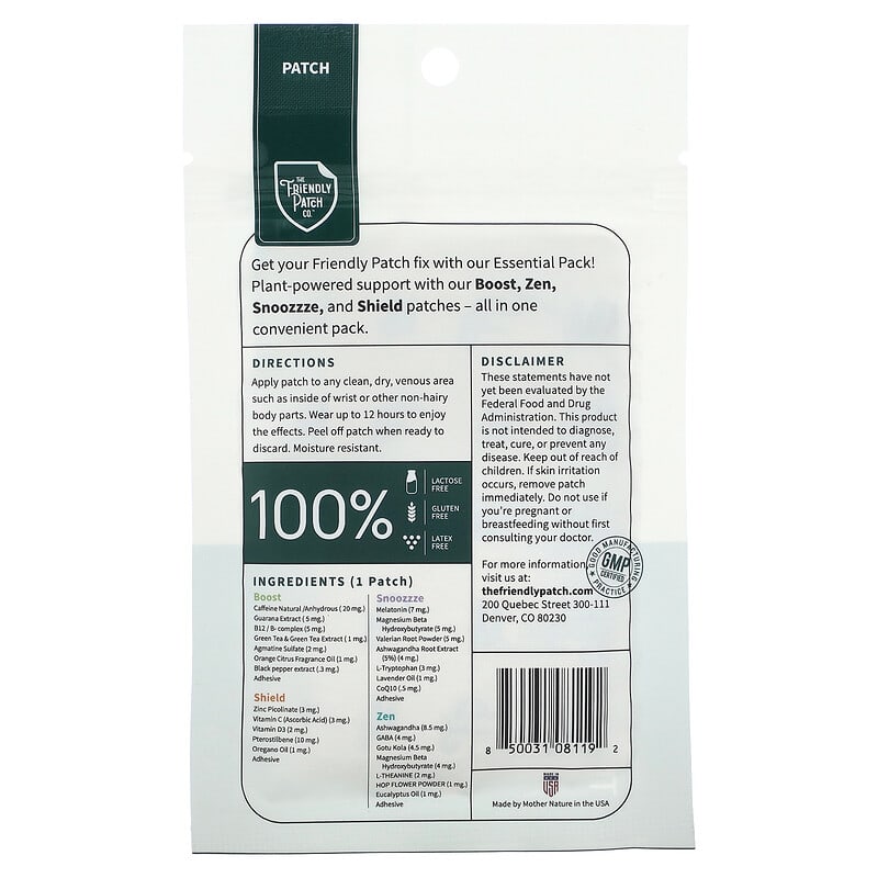 The Friendly Patch The Essentials Multi-Pack 8 Patches là một giải pháp hữu hiệu cho những ai đang tìm kiếm sự hỗ trợ tự nhiên trong việc tăng cường năng lượng, cải thiện giấc ngủ, nâng cao sức đề kháng và giảm căng thẳng. Với sự kết hợp hoàn hảo của các thành phần tự nhiên, sản phẩm không chỉ an toàn mà còn mang lại nhiều lợi ích cho sức khỏe. Hãy thêm sản phẩm này vào chu trình chăm sóc sức khỏe hàng ngày của bạn để cảm nhận sự khác biệt.