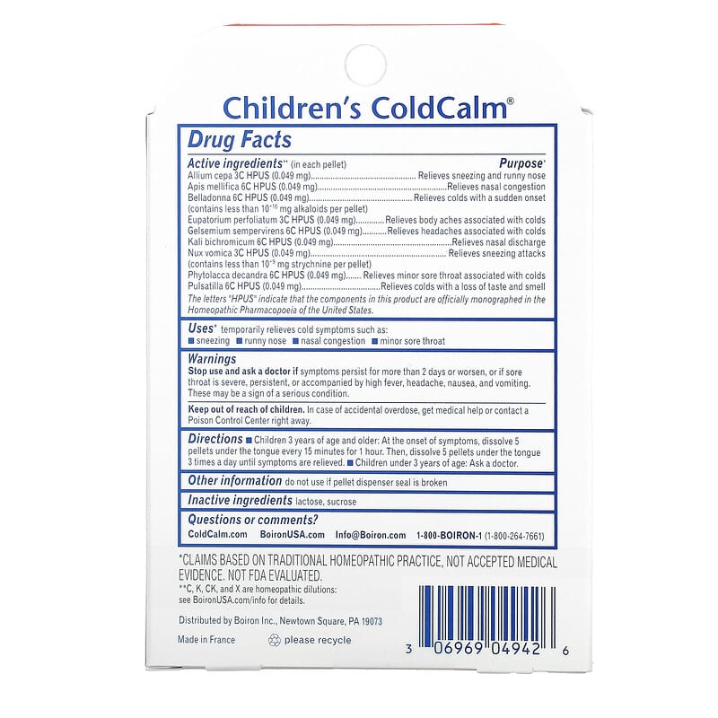 Mỗi viên nang của Boiron Coldcalm chứa các thành phần homeopathic được chứng nhận, bao gồm: