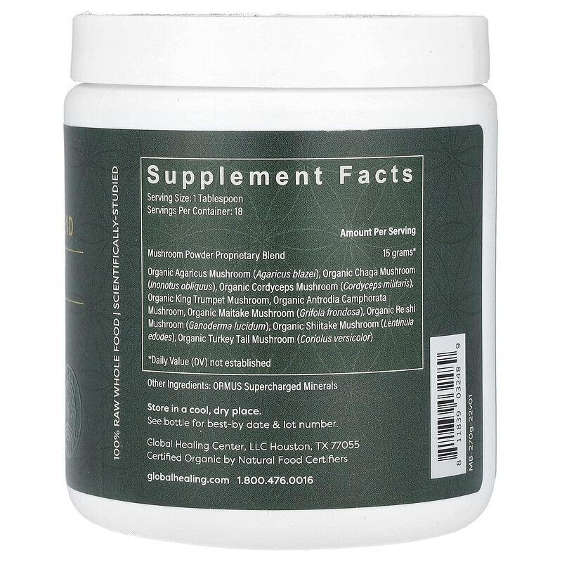 Bột Nấm Hữu Cơ Global Healing 270g, tăng cường sức khỏe, hỗ trợ miễn dịch và làm đẹp da tự nhiên., UPC 811839032489