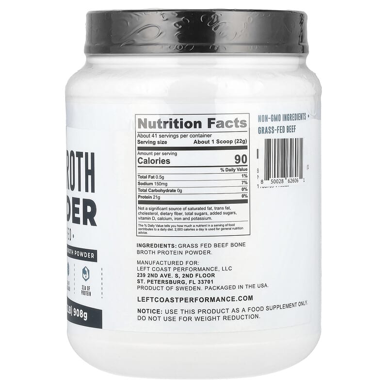 Bột nước dùng xương bò Left Coast Performance 32 oz cung cấp hương vị đậm đà, giàu dinh dưỡng cho món ăn của bạn., UPC 850028626061