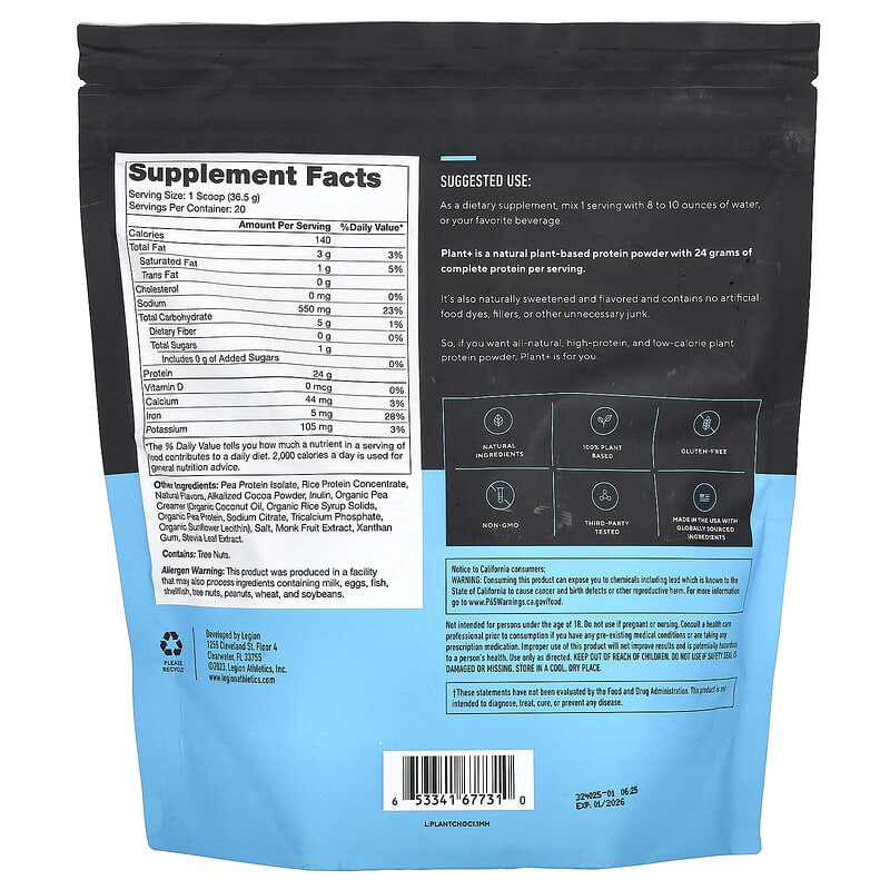 Bột protein thực vật Legion Athletics Plant+ hương socola Hà Lan 730g, bổ sung dinh dưỡng hoàn hảo cho cơ thể khỏe mạnh., UPC 653341677310