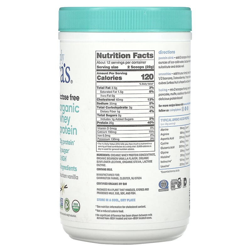 Simply Tera’s Organic Whey Protein Bourbon Vanilla được làm từ 100% whey protein hữu cơ, được chiết xuất từ sữa của những con bò được nuôi dưỡng theo phương pháp chăn thả tự nhiên, không sử dụng hormone tăng trưởng rBGH, thức ăn biến đổi gen (GMO), kháng sinh hay thuốc trừ sâu. Sản phẩm này chứa:
