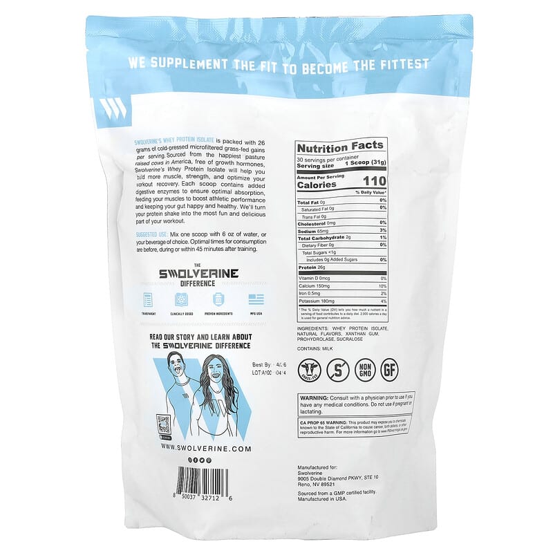 Swolverine Whey Isolate Chocolate Milkshake 2,05 lb (930 g) là sản phẩm protein chất lượng cao đến từ thương hiệu Swolverine, nổi bật với công thức whey protein isolate tự nhiên, cung cấp 26g protein trong mỗi khẩu phần. Sản phẩm này được chiết xuất từ sữa của những con bò được nuôi dưỡng hoàn toàn bằng cỏ, không chứa hormone tăng trưởng và được sản xuất tại các cơ sở đạt tiêu chuẩn GMP.