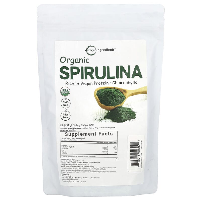 Bột Spirulina Hữu Cơ Micro Ingredients 1 lb cung cấp dinh dưỡng tự nhiên, hỗ trợ sức khỏe và tăng cường năng lượng., UPC 850015616457