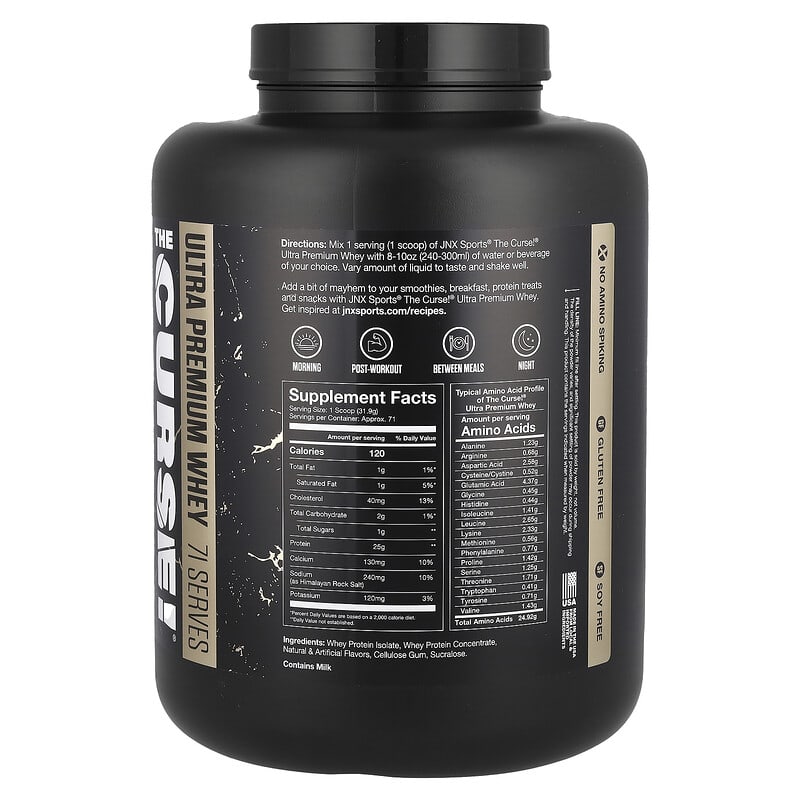 JNX Sports The Curse!® Ultra Premium Whey chứa 25 g protein mỗi lần dùng với nguồn chính là whey protein isolate (WPI). Sản phẩm còn cung cấp 5.5 g BCAAs (axit amin chuỗi nhánh) tự nhiên giúp hỗ trợ sức bền và phục hồi cơ bắp. Các thành phần chính bao gồm:
