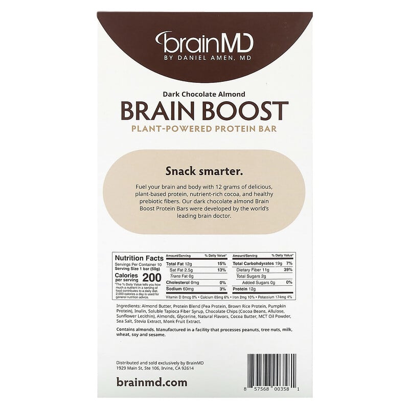 Thanh protein thực vật BrainMD Brain Boost hương hạnh nhân sô cô la đen, dinh dưỡng cao, bổ não, tiện lợi, 10 thanh 1.5 oz., UPC 857568003581