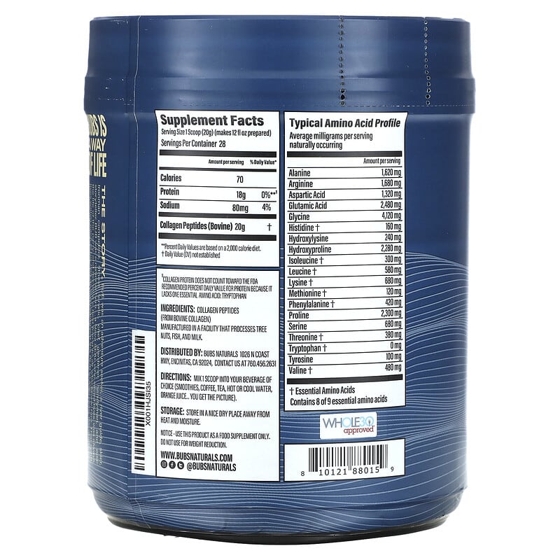 Peptit Collagen BUBS Naturals 567g không mùi vị, hỗ trợ sức khỏe da, tóc và móng, dễ dàng pha trộn vào đồ uống., UPC 810121880159