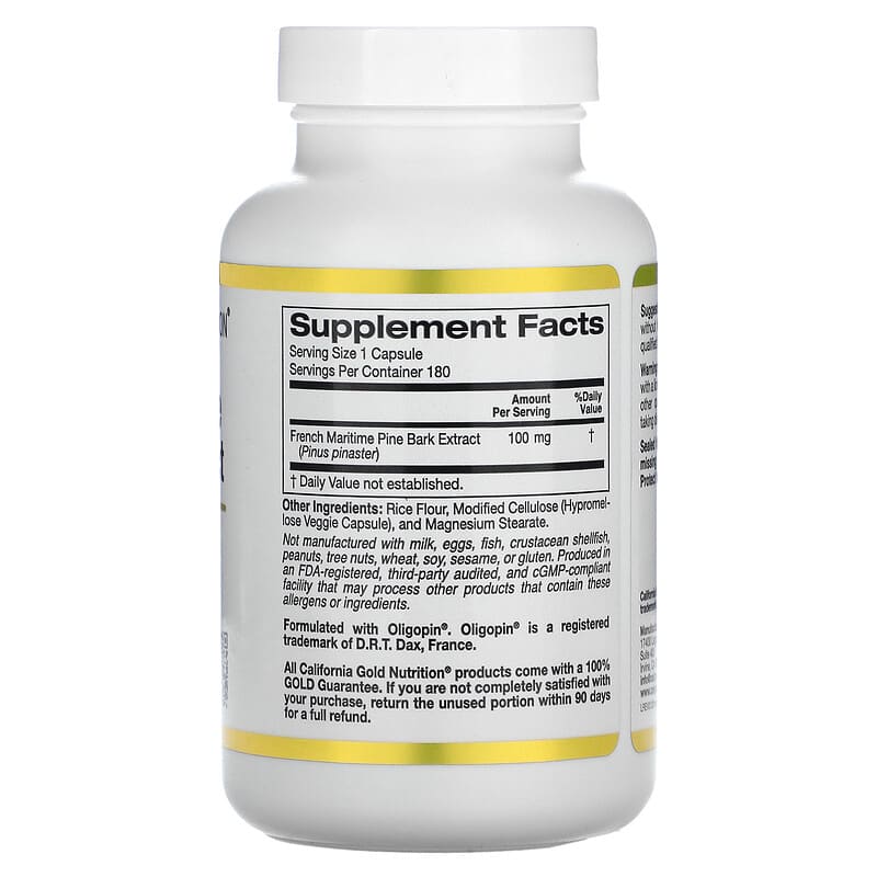California Gold Nutrition French Maritime Pine Bark Extract Oligopin 100 mg 180 Veggie Capsules là một sản phẩm bổ sung dinh dưỡng nổi bật, được chiết xuất từ vỏ cây thông Pháp (Pinus pinaster). Sản phẩm này không chỉ hỗ trợ sức khỏe tổng thể mà còn mang lại nhiều lợi ích cho sức khỏe tim mạch và khả năng chống oxy hóa.