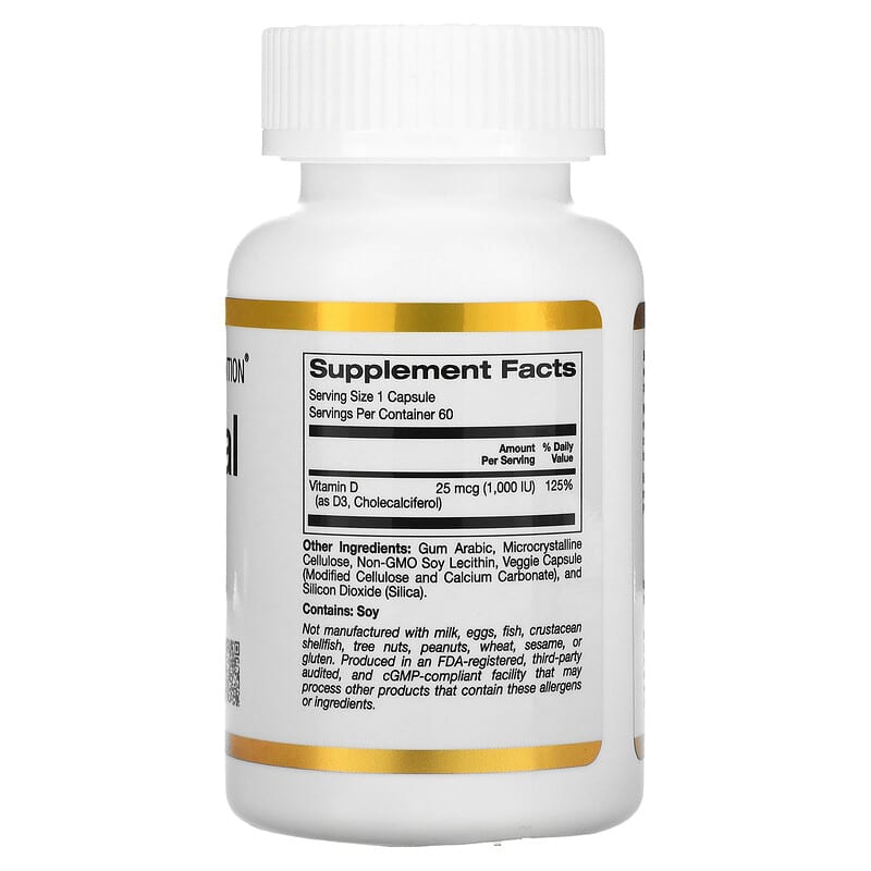 Vitamin D (as D3, Cholecalciferol) | 25 mcg (1,000 IU) | 125% |