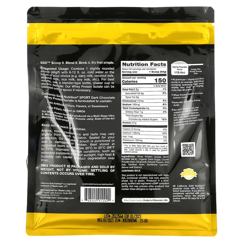 Giới thiệu sản phẩm California Gold Nutrition SPORT – Dark Chocolate Whey Protein Isolate 2 lbs (907 g)