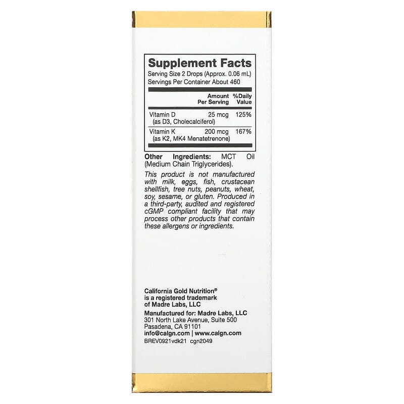 Giới thiệu California Gold Nutrition Vitamin D3 & K2 25 mcg (1000 IU) 1 fl oz (30 ml)
