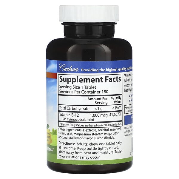 Thông tin sản phẩm Carlson, Chewable B-12, Natural Lemon, 1.000 mcg, 180 viên