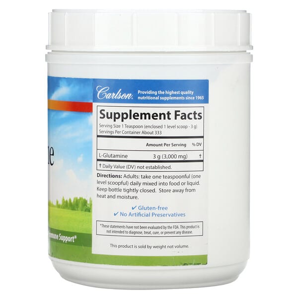 Carlson, L-Glutamine Powder được sản xuất từ glutamine tinh khiết, không chứa gluten, không có chất bảo quản nhân tạo, đảm bảo an toàn cho người sử dụng. Mỗi muỗng (3 g) cung cấp 3.000 mg L-Glutamine, tương ứng với các yêu cầu dinh dưỡng hằng ngày, mặc dù giá trị hàng ngày chưa được thiết lập.