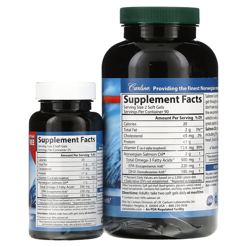 Mỗi khẩu phần (2 viên nang mềm) của Carlson Norwegian Salmon Oil cung cấp: