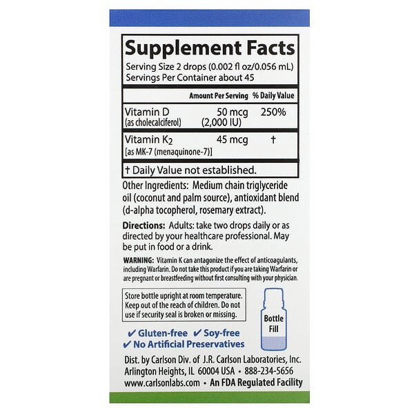 Thông tin sản phẩm Carlson, Super Daily D3 + K2, 90 Vegetarian Drops, 0,086 fl oz (2,54 ml)
