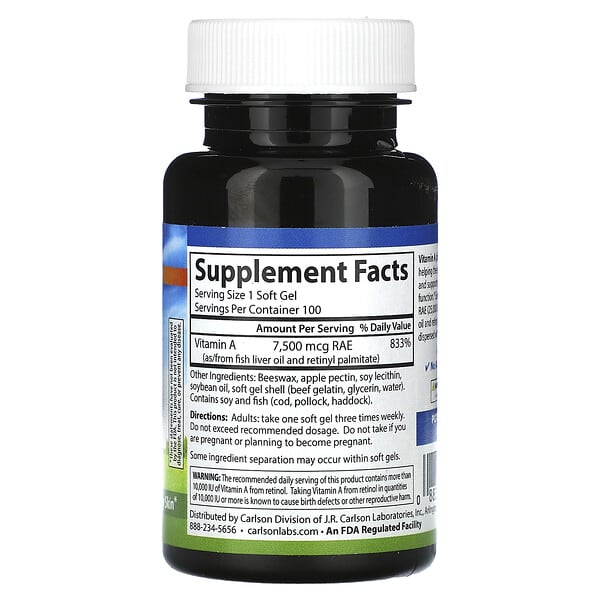 Mỗi viên nang mềm của sản phẩm Carlson chứa 7.500 mcg RAE (25.000 IU) vitamin A được chiết xuất từ dầu gan cá và retinyl palmitate. Các thành phần khác bao gồm: