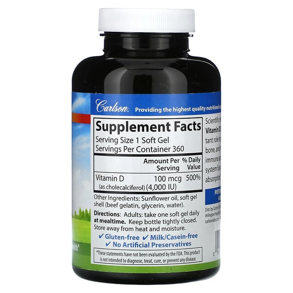 Thông tin sản phẩm Carlson, Vitamin D3, 100 mcg (4.000 IU), 360 viên