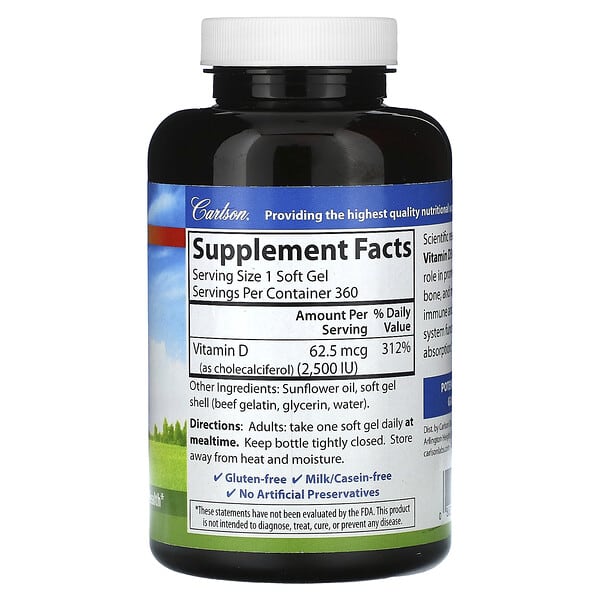 Thông tin sản phẩm Carlson, Vitamin D3, 62,5 mcg (2.500 IU), 360 viên