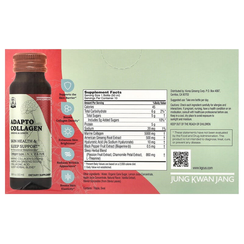 CheongKwanJang Adapto Collagen Ginseng & Lemon là sản phẩm lý tưởng cho những ai đang tìm kiếm một giải pháp tự nhiên để cải thiện sức khỏe làn da và hỗ trợ giấc ngủ. Với sự kết hợp hoàn hảo giữa collagen, nhân sâm Mỹ và các thảo dược tự nhiên, sản phẩm không chỉ giúp bạn có một làn da khỏe mạnh, mà còn mang lại giấc ngủ ngon và thư giãn. Hãy trải nghiệm sản phẩm để cảm nhận sự khác biệt!