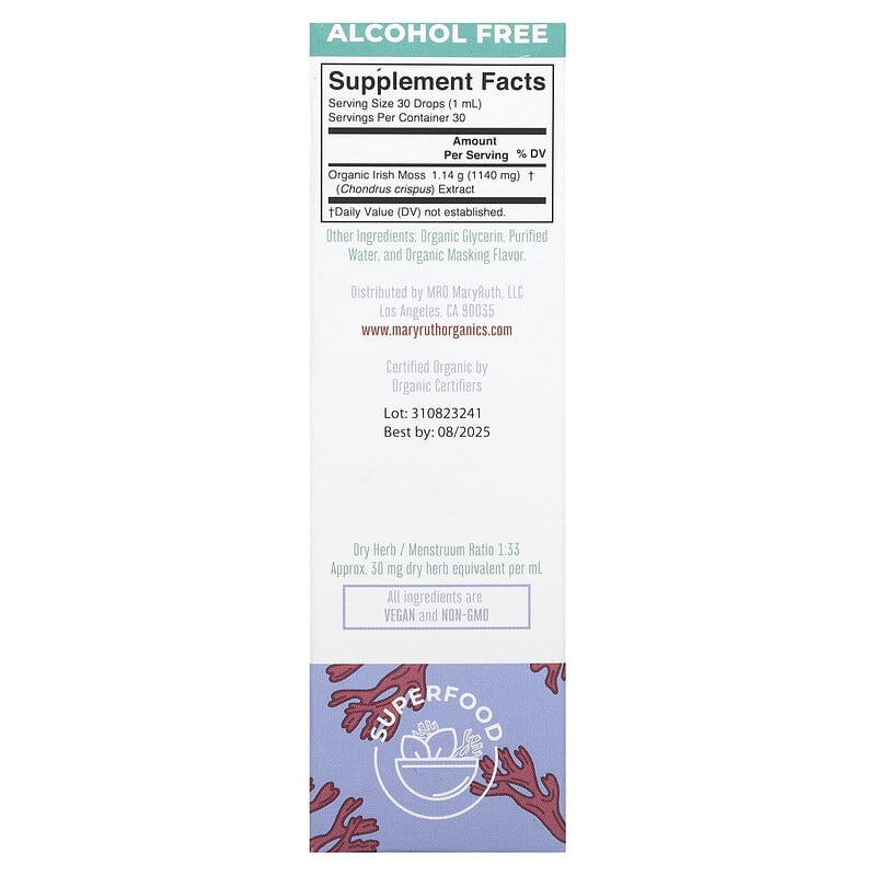 MaryRuth’s Organic Sea Moss Liquid Extract được chiết xuất từ tảo biển Ireland (Chondrus crispus), một loại thực vật giàu vitamin và khoáng chất. Mỗi liều dùng (30 giọt tương đương 1 ml) cung cấp khoảng 1.140 mg chiết xuất Irish Moss. Sản phẩm hoàn toàn hữu cơ, không chứa GMO, và được chứng nhận organic bởi Organic Certifiers. Đặc biệt, mọi thành phần trong sản phẩm đều là thuần chay và an toàn cho người sử dụng.