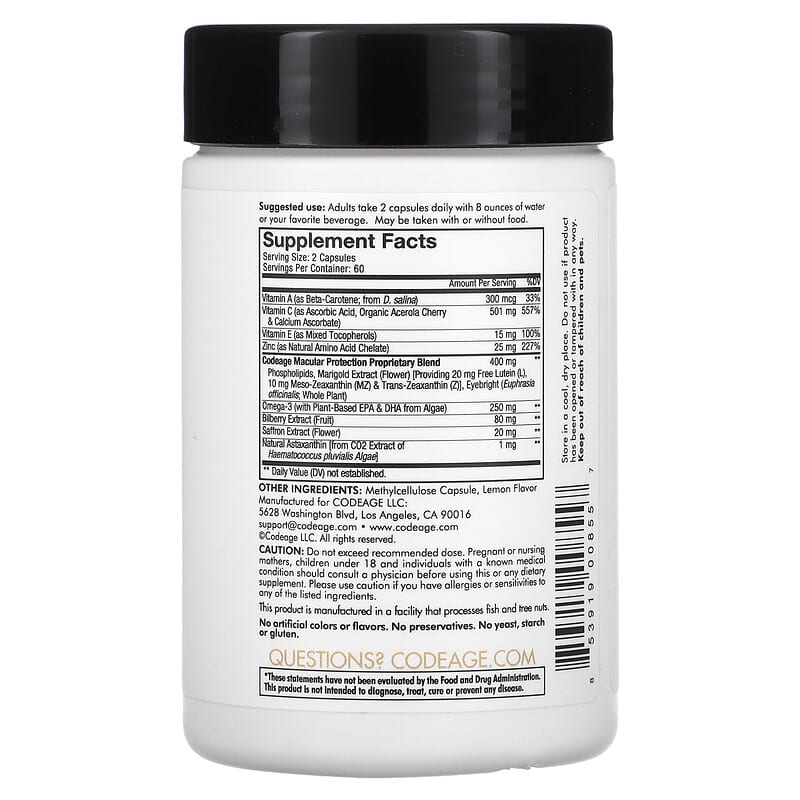 Codeage Macular Protection Proprietary Blend Phospholipids, Marigold Extract (Flower) [Providing 20 mg Free Lutein (L), 10 mg Meso-Zeaxanthin (MZ) & Trans- Zeaxanthin (Z)], Eyebright (Euphrasia officinalis; Whole Plant) | 400 mg | ** |