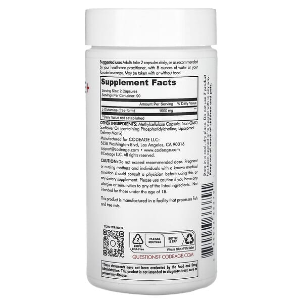 Thông tin sản phẩm Codeage, Liposomal L-Glutamine+, 180 viên