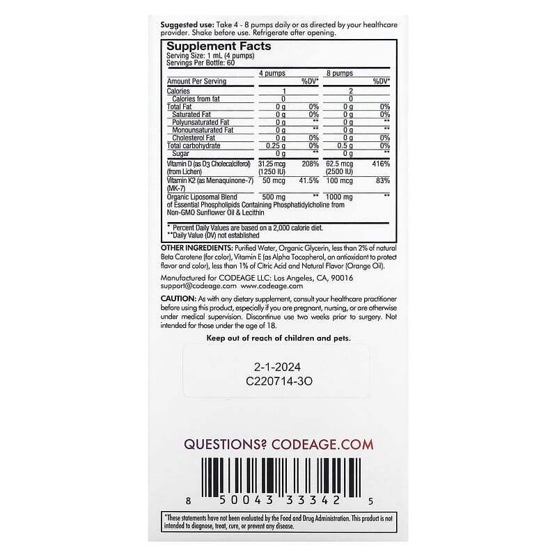Sản phẩm Codeage Liposomal Vitamin D3+K2 chứa các thành phần chính sau: