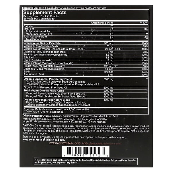 – Organic Liposomal Proprietary Blend: chứa dầu hạt hướng dương và dầu hạt lanh, cung cấp omega-3 và omega-9.