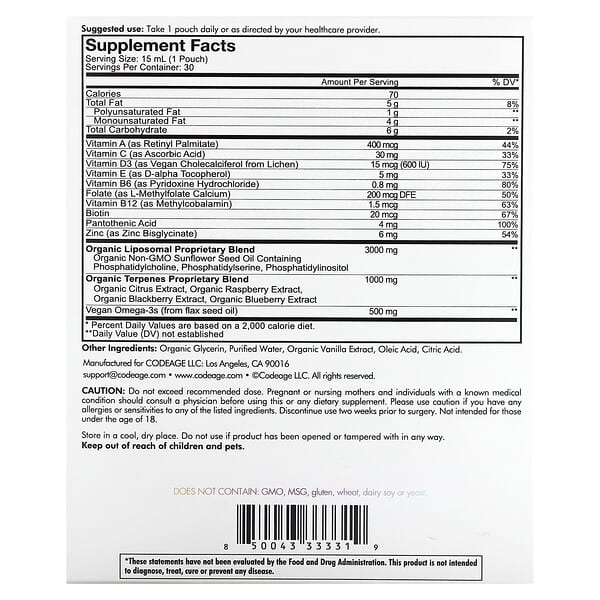 Codeage Teen Daily Formula Liposomal Delivery Essential Vitamins Omega-3 Berry 30 Pouches 0.5 fl oz nhập khẩu chính hãng từ Mỹ., UPC: 850043333319