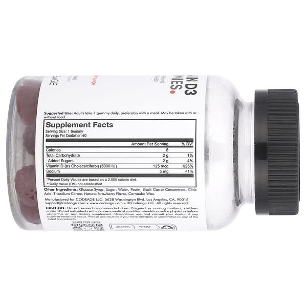 Thông tin sản phẩm Codeage, Vitamin D3 Gummies, Strawberry, 5.000 IU, 60 viên nhai